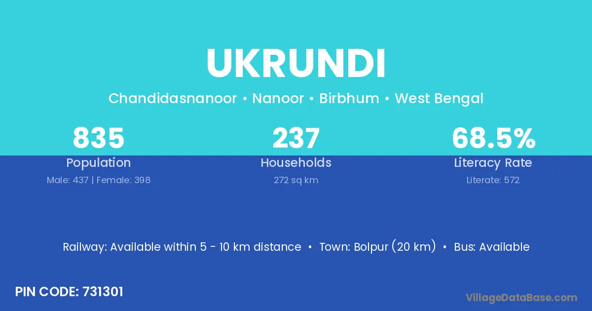 Bolpur (20 km) is the nearest town to Ukrundi village for major economic activities and is located approximately 20 km away.