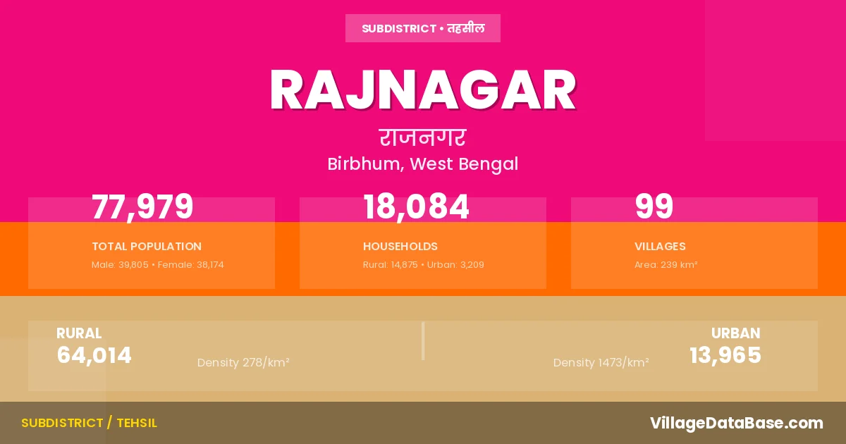 Rajnagar is a town and Subdivision in the Birbhum district of the West Bengal. In India, a Subdivision is a subdivision of a district responsible for the administration and revenue collection of a specific area within the district. Subdivisions play a crucial role in the local governance structure, contributing significantly to the development and administration of their communities.