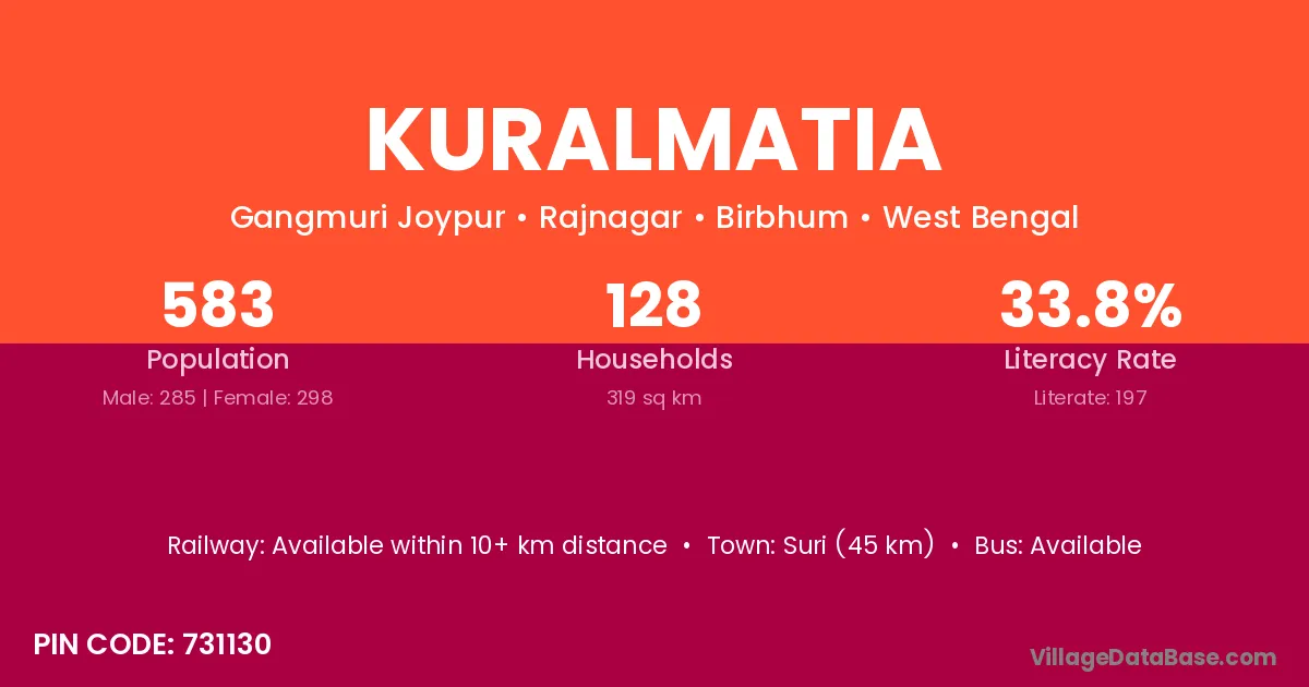 Suri (45 km) is the nearest town to Kuralmatia village for major economic activities and is located approximately 45 km away.