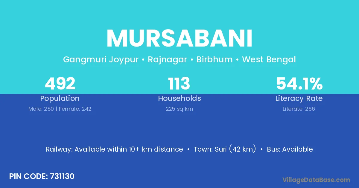 Suri (42 km) is the nearest town to Mursabani village for major economic activities and is located approximately 42 km away.