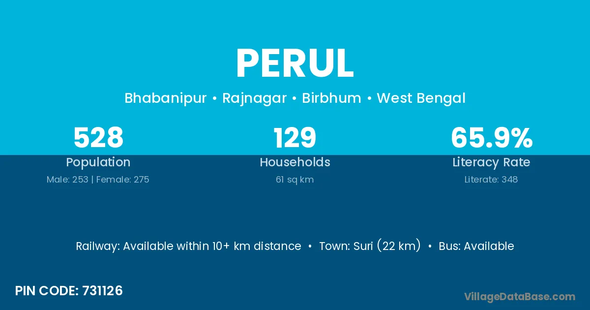 Suri (22 km) is the nearest town to Perul village for major economic activities and is located approximately 22 km away.