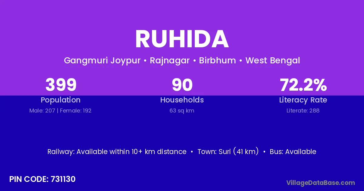 Suri (41 km) is the nearest town to Ruhida village for major economic activities and is located approximately 41 km away.
