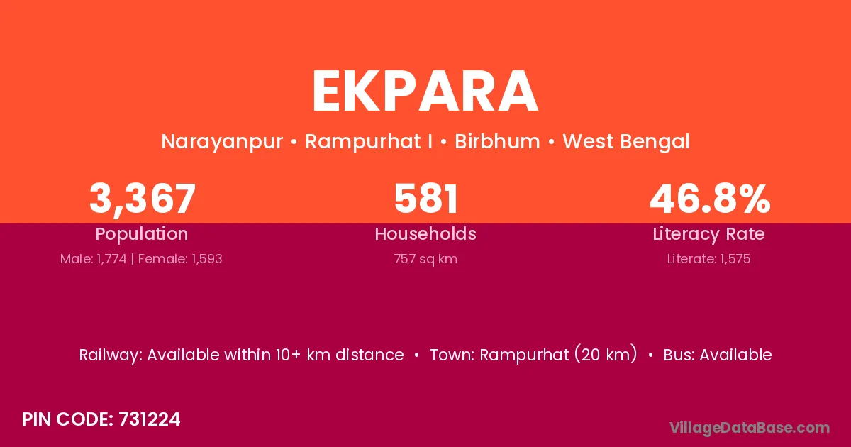 Rampurhat (20 km) is the nearest town to Ekpara village for major economic activities and is located approximately 20 km away.