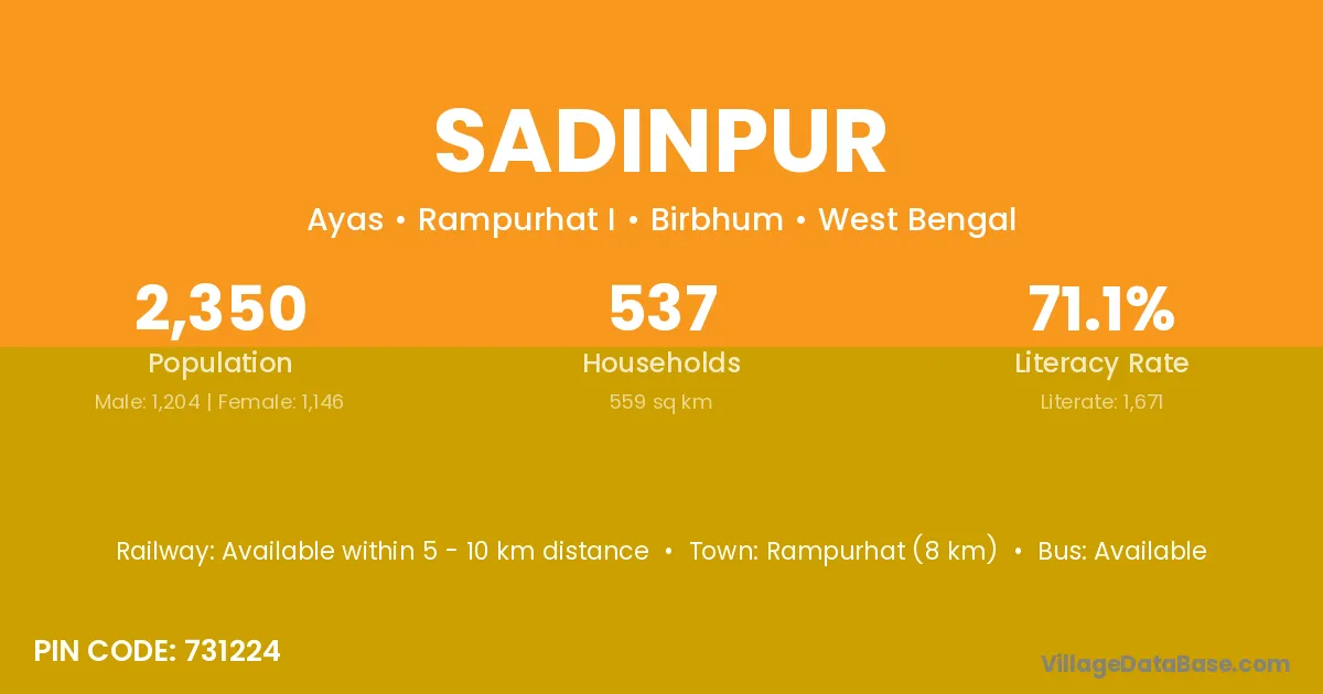 Rampurhat (8 km) is the nearest town to Sadinpur village for major economic activities and is located approximately 8 km away.