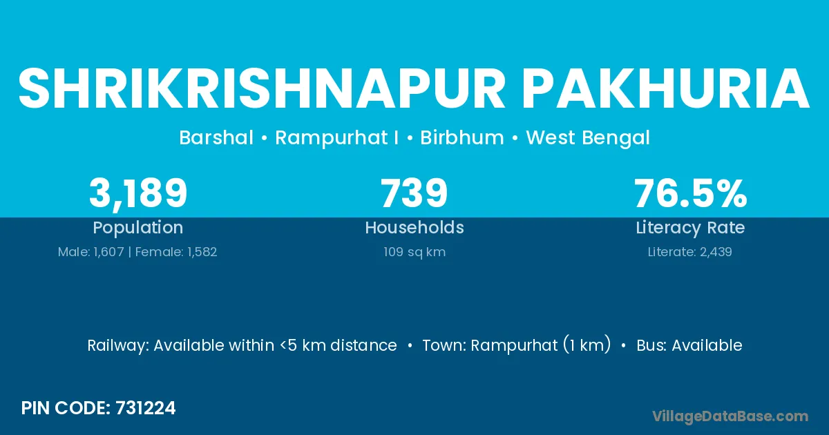 Rampurhat (1 km) is the nearest town to Shrikrishnapur Pakhuria village for major economic activities and is located approximately 1 km away.