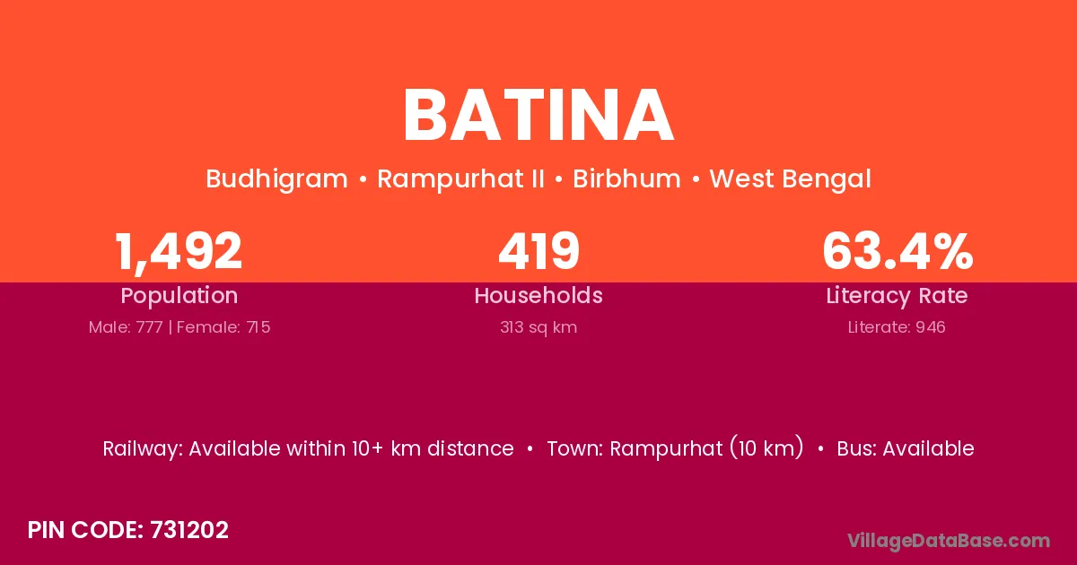 Rampurhat (10 km) is the nearest town to Batina village for major economic activities and is located approximately 10 km away.