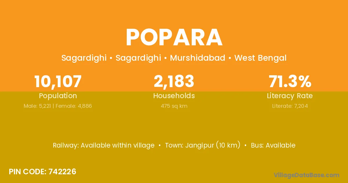 Rampurhat (112 km) is the nearest town to Popara village for major economic activities and is located approximately 112 km away.