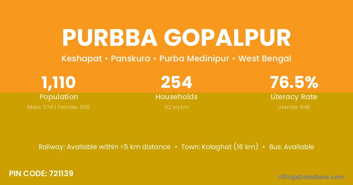 Rampurhat (25 km) is the nearest town to Purbba Gopalpur village for major economic activities and is located approximately 25 km away.