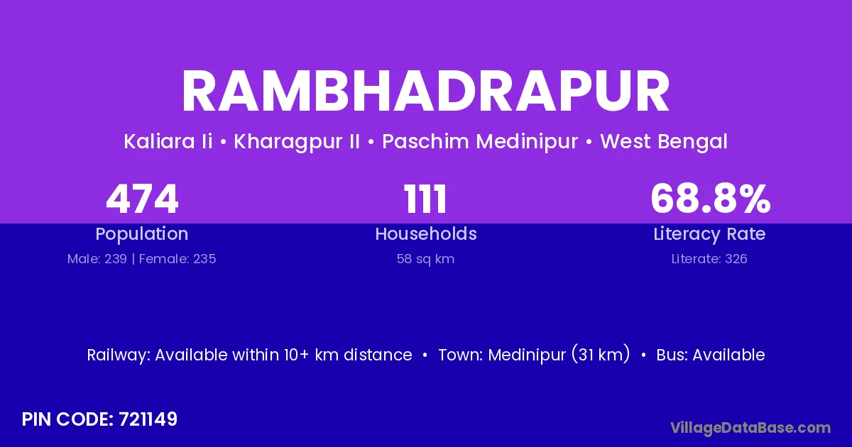 Rampurhat (11 km) is the nearest town to Rambhadrapur village for major economic activities and is located approximately 11 km away.