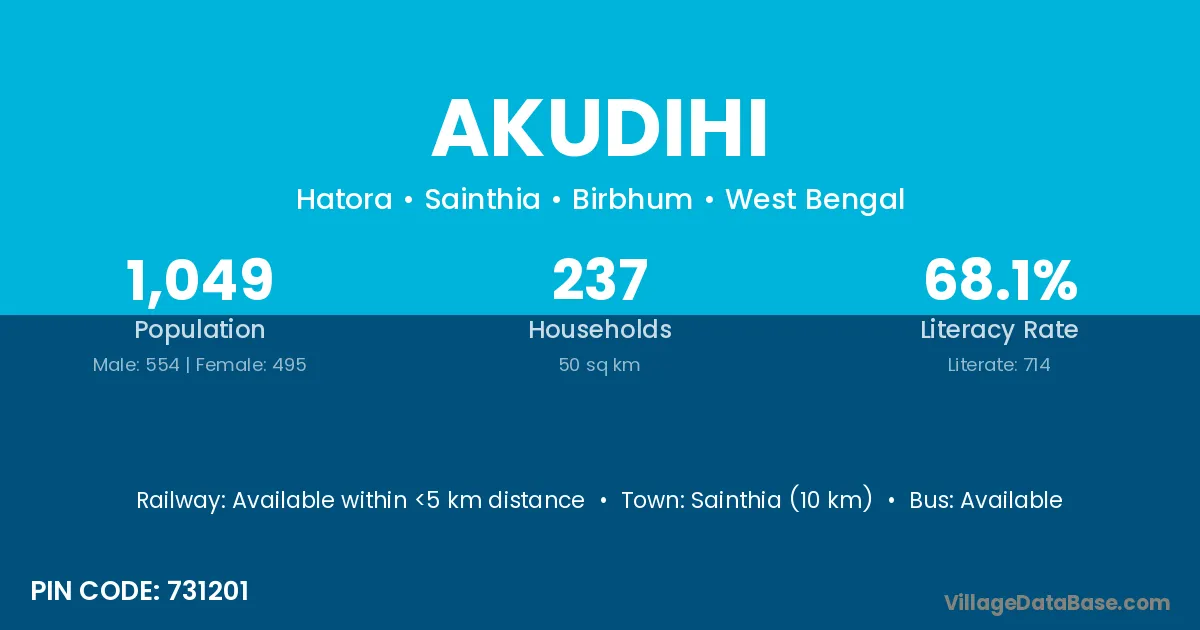 Sainthia (10 km) is the nearest town to Akudihi village for major economic activities and is located approximately 10 km away.