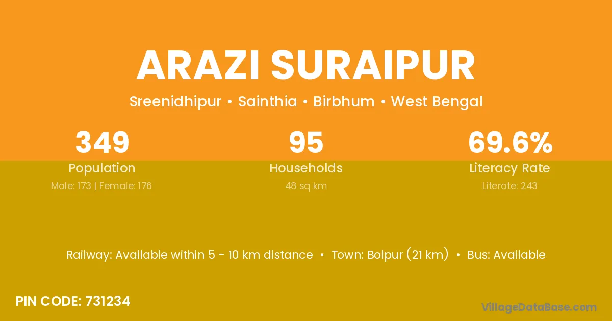 Bolpur (21 km) is the nearest town to Arazi Suraipur village for major economic activities and is located approximately 21 km away.