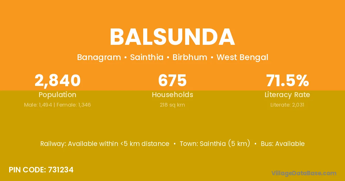 Sainthia (5 km) is the nearest town to Balsunda village for major economic activities and is located approximately 5 km away.