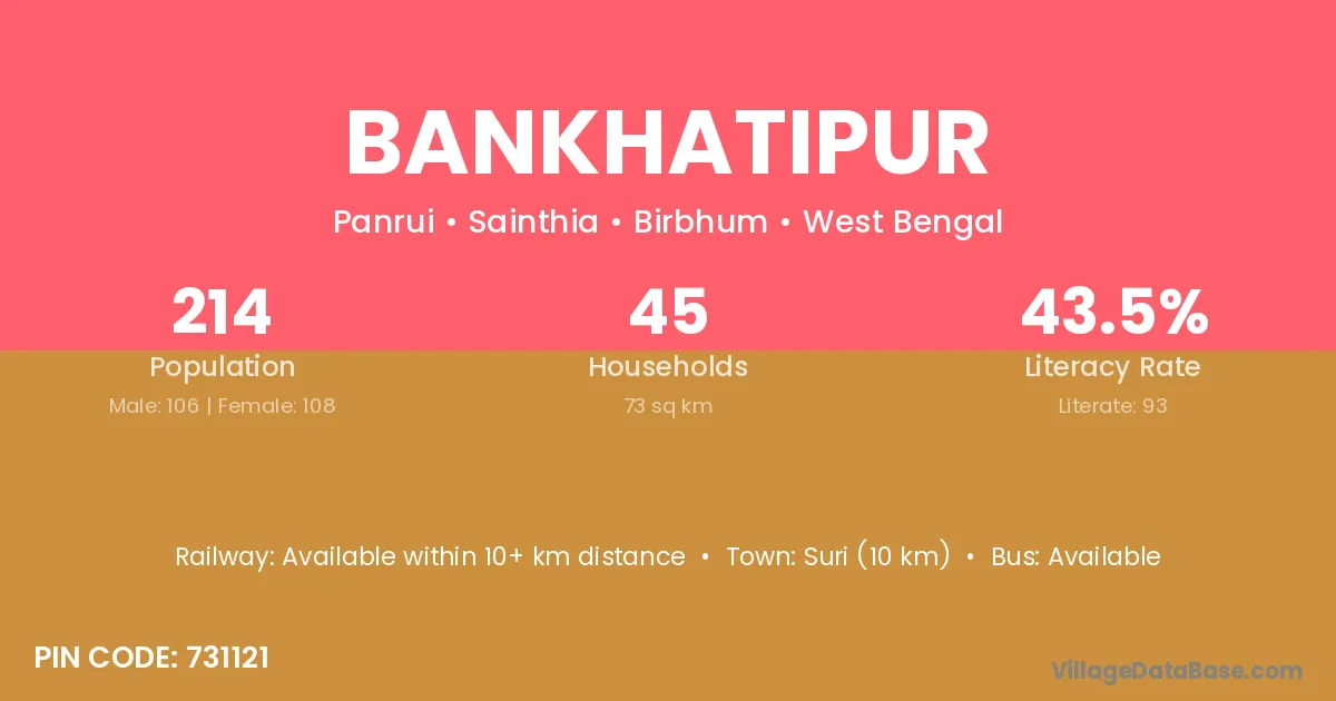 Suri (10 km) is the nearest town to Bankhatipur village for major economic activities and is located approximately 10 km away.