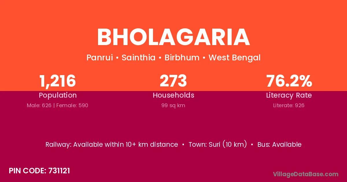 Suri (10 km) is the nearest town to Bholagaria village for major economic activities and is located approximately 10 km away.