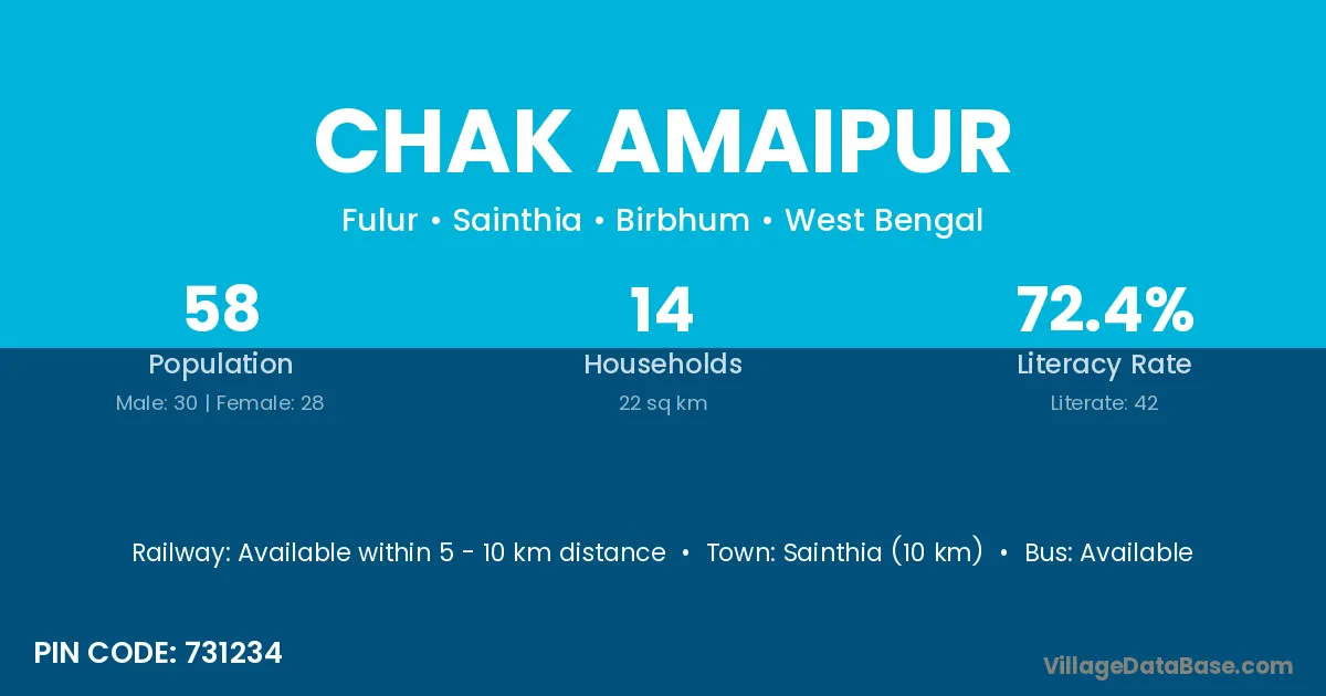 Sainthia (10 km) is the nearest town to Chak Amaipur village for major economic activities and is located approximately 10 km away.
