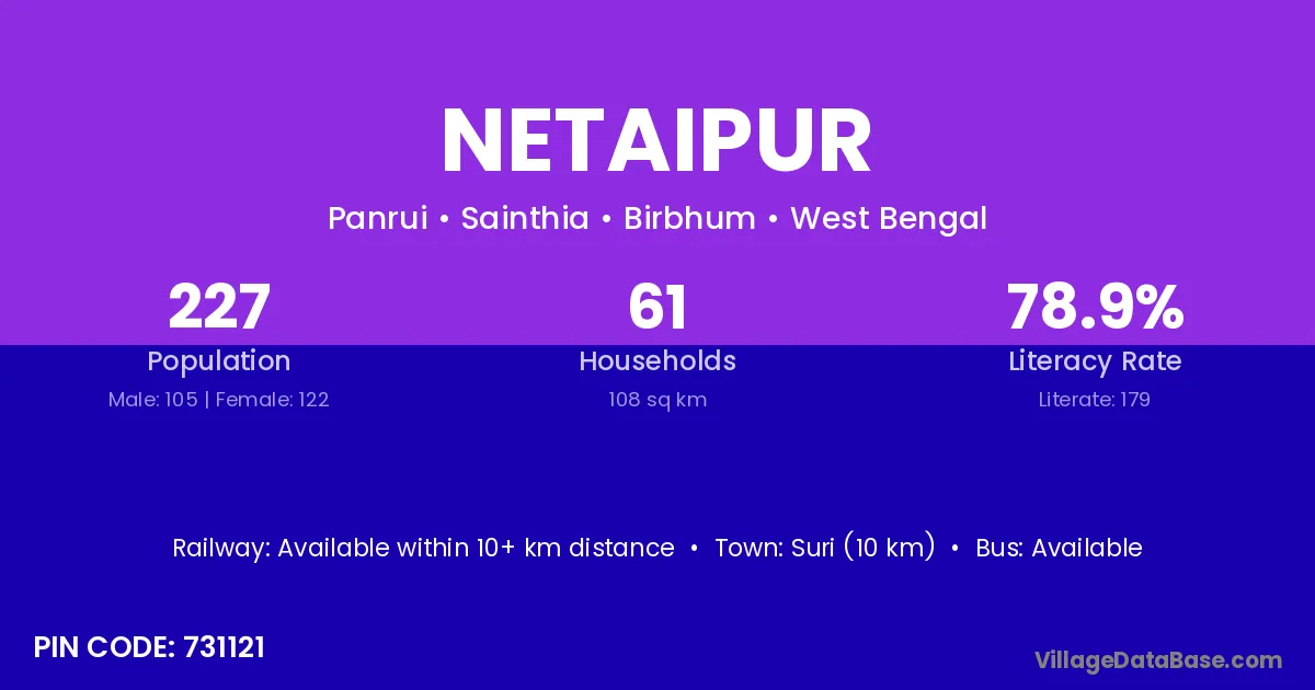 Suri (10 km) is the nearest town to Netaipur village for major economic activities and is located approximately 10 km away.