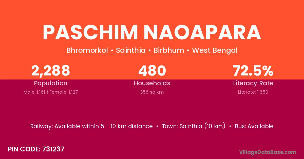 Sainthia (10 km) is the nearest town to Paschim Naoapara village for major economic activities and is located approximately 10 km away.