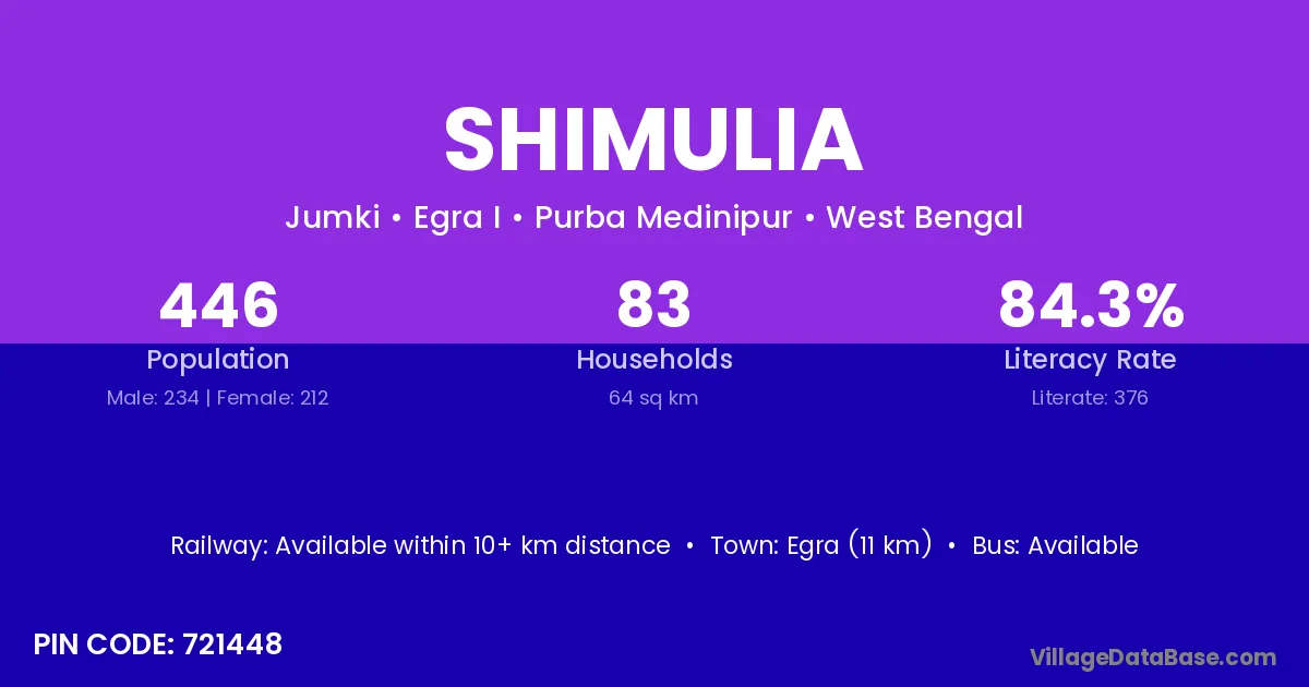Sainthia (10 km) is the nearest town to Shimulia village for major economic activities and is located approximately 10 km away.