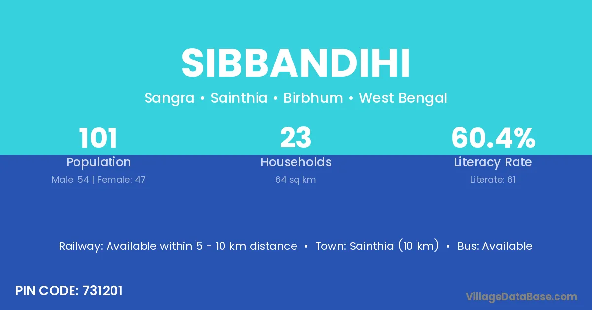 Sainthia (10 km) is the nearest town to Sibbandihi village for major economic activities and is located approximately 10 km away.