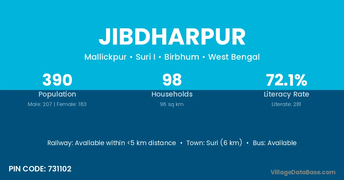 Suri (6 km) is the nearest town to Jibdharpur village for major economic activities and is located approximately 6 km away.