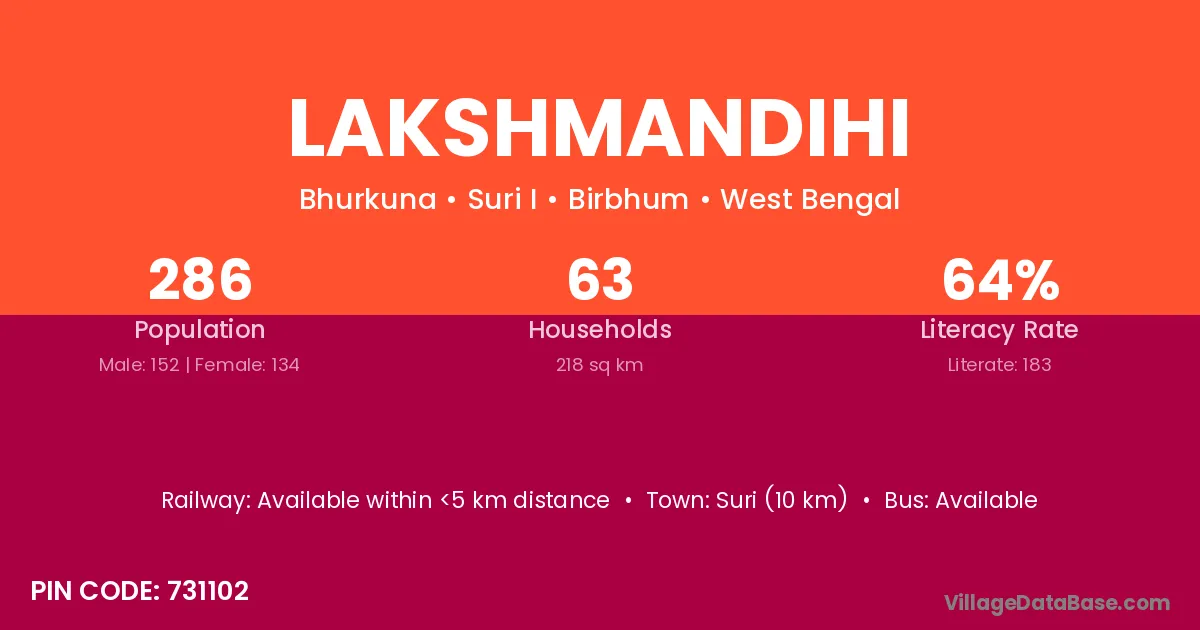 Suri (10 km) is the nearest town to Lakshmandihi village for major economic activities and is located approximately 10 km away.