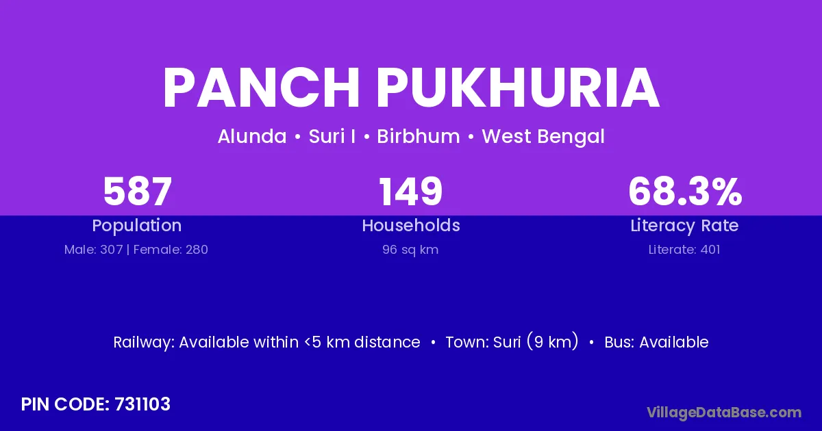 Suri (9 km) is the nearest town to Panch Pukhuria village for major economic activities and is located approximately 9 km away.
