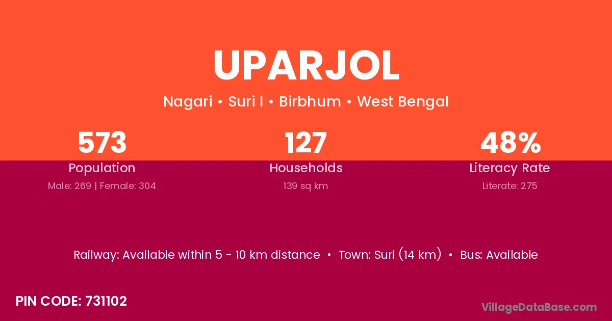 Suri (14 km) is the nearest town to Uparjol village for major economic activities and is located approximately 14 km away.