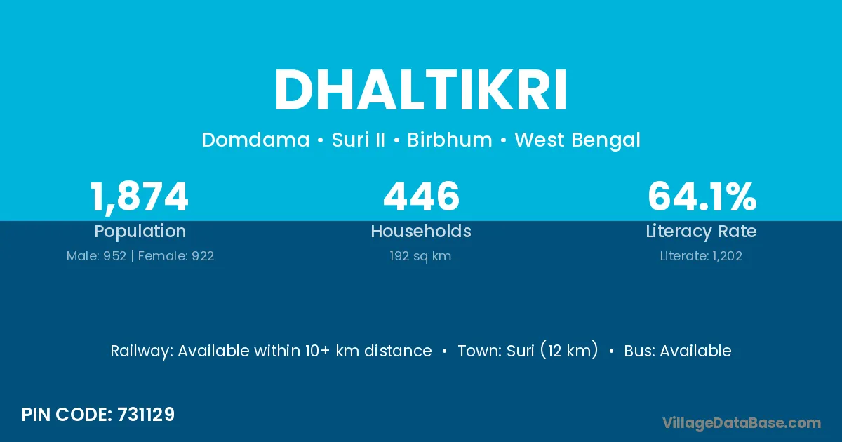 Suri (12 km) is the nearest town to Dhaltikri village for major economic activities and is located approximately 12 km away.