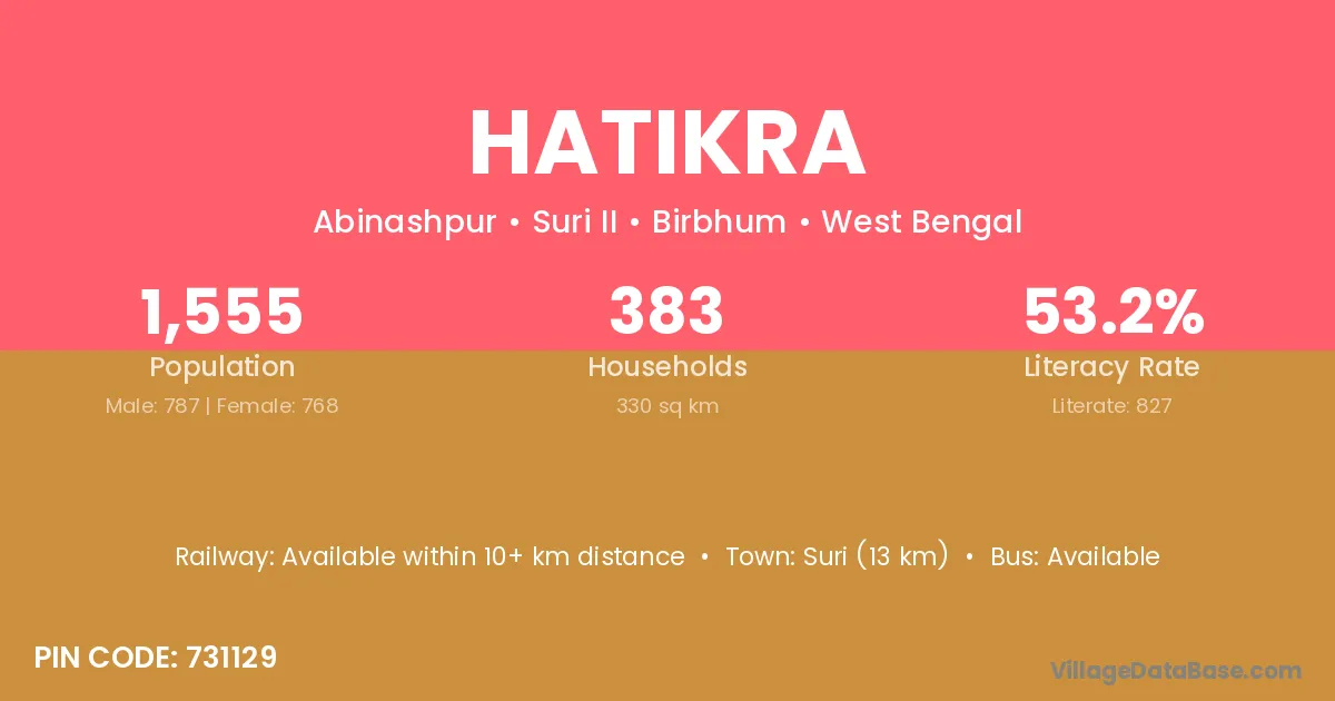 Suri (13 km) is the nearest town to Hatikra village for major economic activities and is located approximately 13 km away.