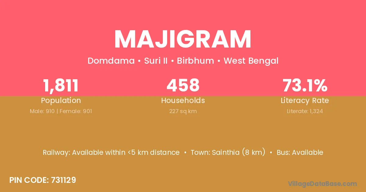 Sainthia (8 km) is the nearest town to Majigram village for major economic activities and is located approximately 8 km away.