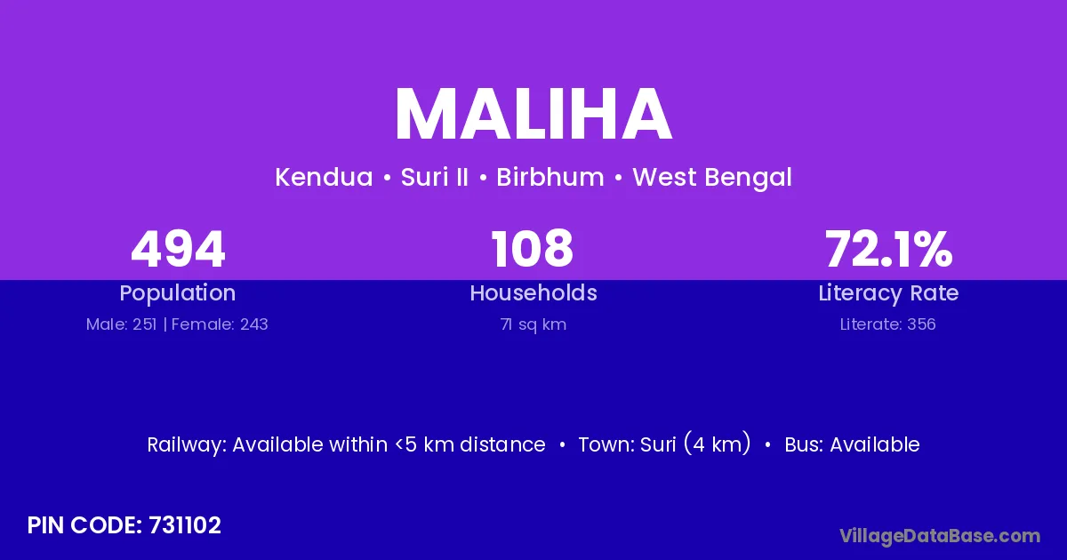 Suri (4 km) is the nearest town to Maliha village for major economic activities and is located approximately 4 km away.