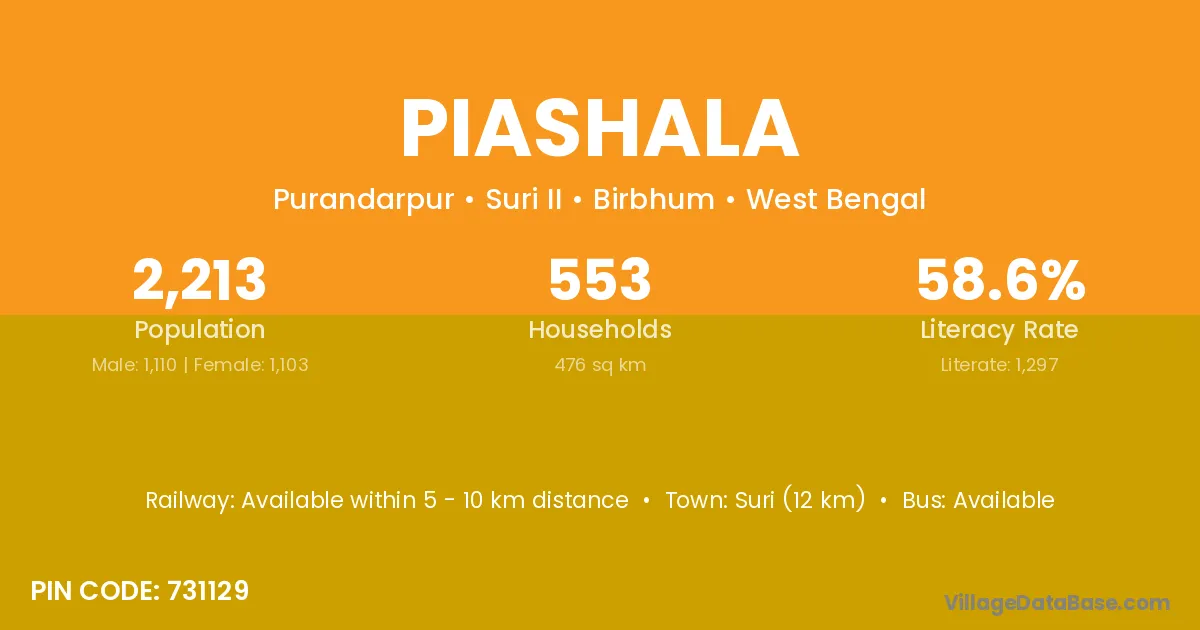 Suri (12 km) is the nearest town to Piashala village for major economic activities and is located approximately 12 km away.