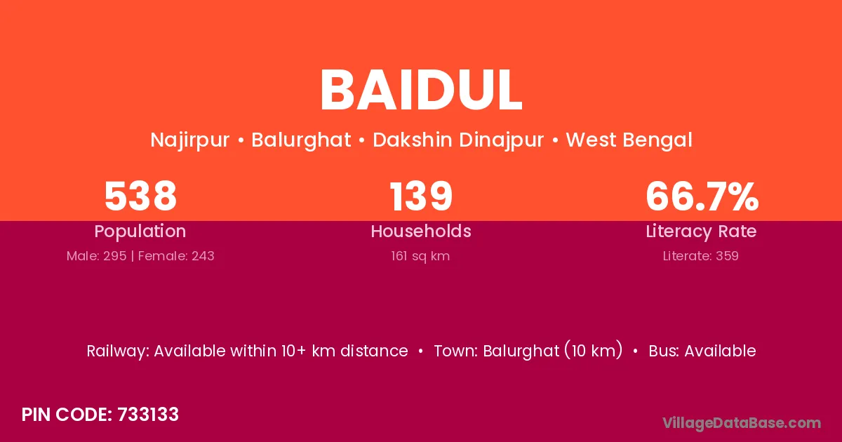Balurghat (10 km) is the nearest town to Baidul village for major economic activities and is located approximately 10 km away.