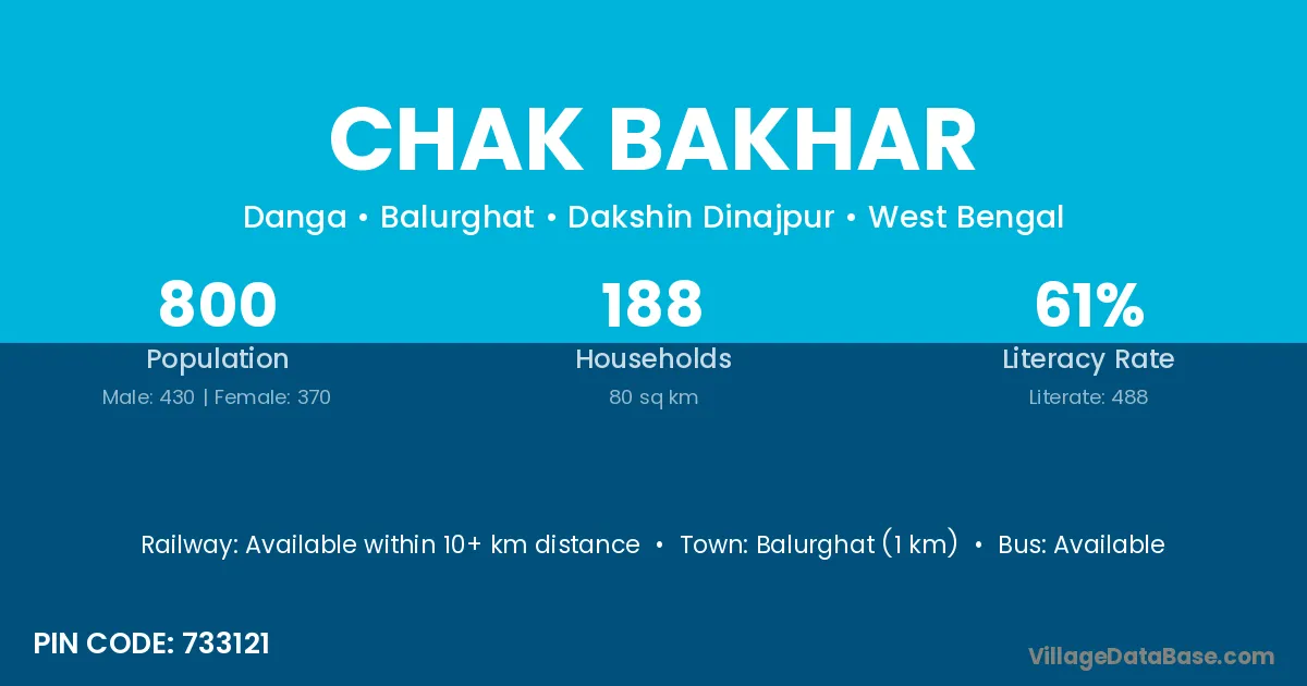 Balurghat (1 km) is the nearest town to Chak Bakhar village for major economic activities and is located approximately 1 km away.