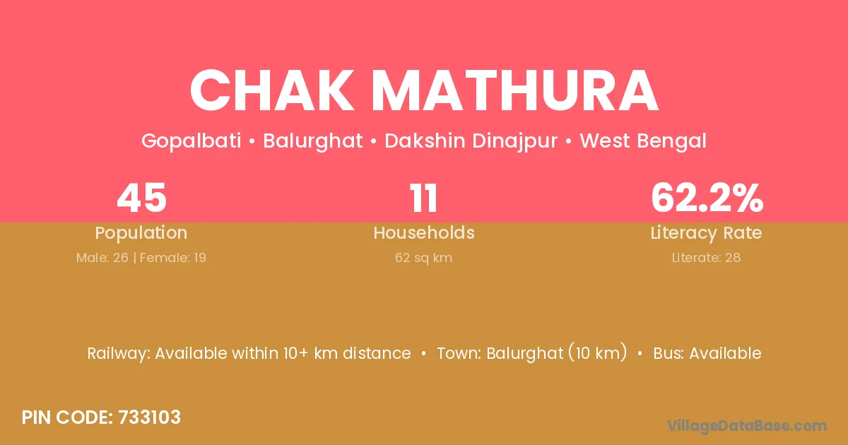 Balurghat (10 km) is the nearest town to Chak Mathura village for major economic activities and is located approximately 10 km away.