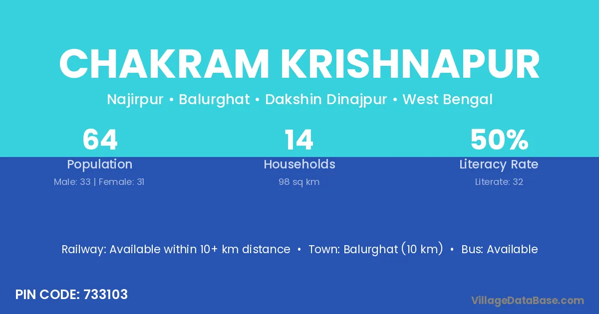 Balurghat (10 km) is the nearest town to Chakram Krishnapur village for major economic activities and is located approximately 10 km away.