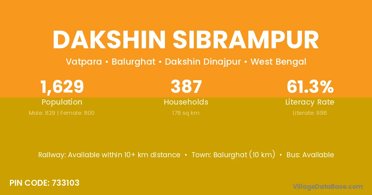 Balurghat (10 km) is the nearest town to Dakshin Sibrampur village for major economic activities and is located approximately 10 km away.