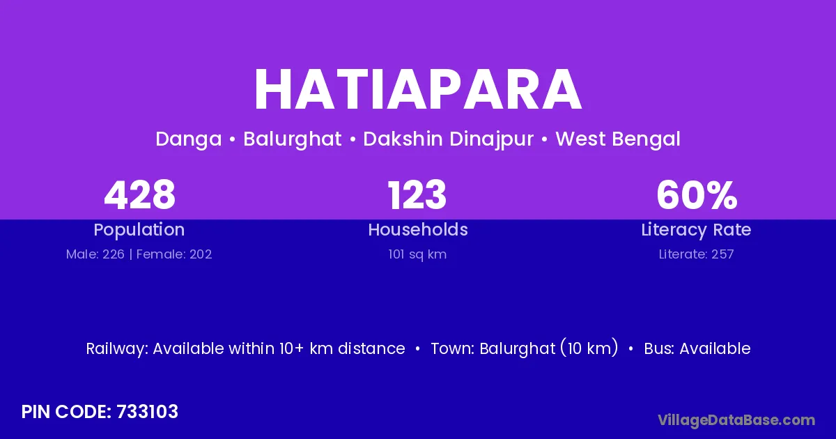 Balurghat (10 km) is the nearest town to Hatiapara village for major economic activities and is located approximately 10 km away.