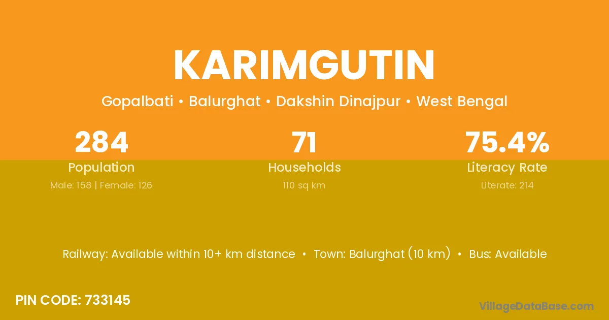 Balurghat (10 km) is the nearest town to Karimgutin village for major economic activities and is located approximately 10 km away.