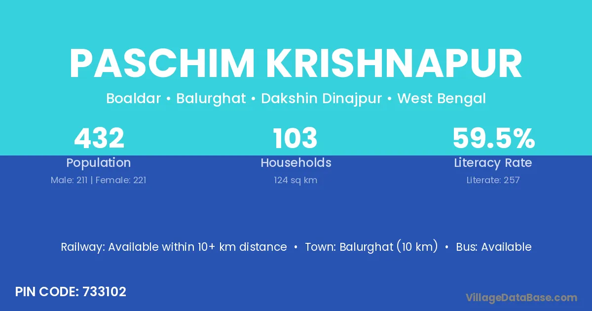 Paschim Krishnapur village has a total population of 432 people, of which 211 are males and 221 are females.