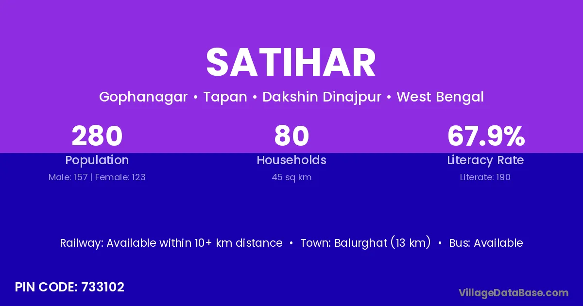 Balurghat (10 km) is the nearest town to Satihar village for major economic activities and is located approximately 10 km away.