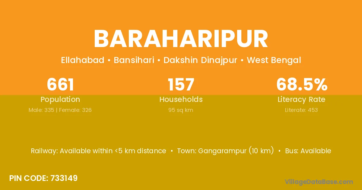 Gangarampur (10 km) is the nearest town to Baraharipur village for major economic activities and is located approximately 10 km away.