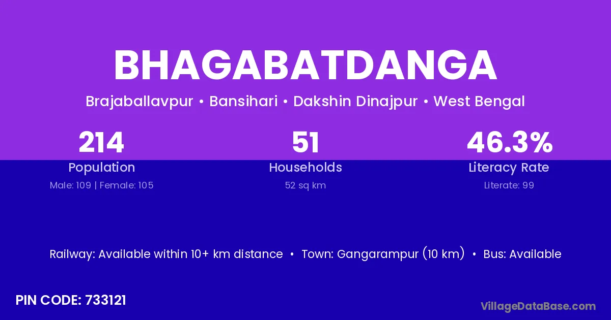 Bhagabatdanga village has a total population of 214 people, of which 109 are males and 105 are females.