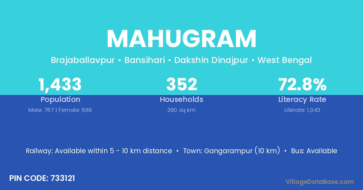 Gangarampur (10 km) is the nearest town to Mahugram village for major economic activities and is located approximately 10 km away.