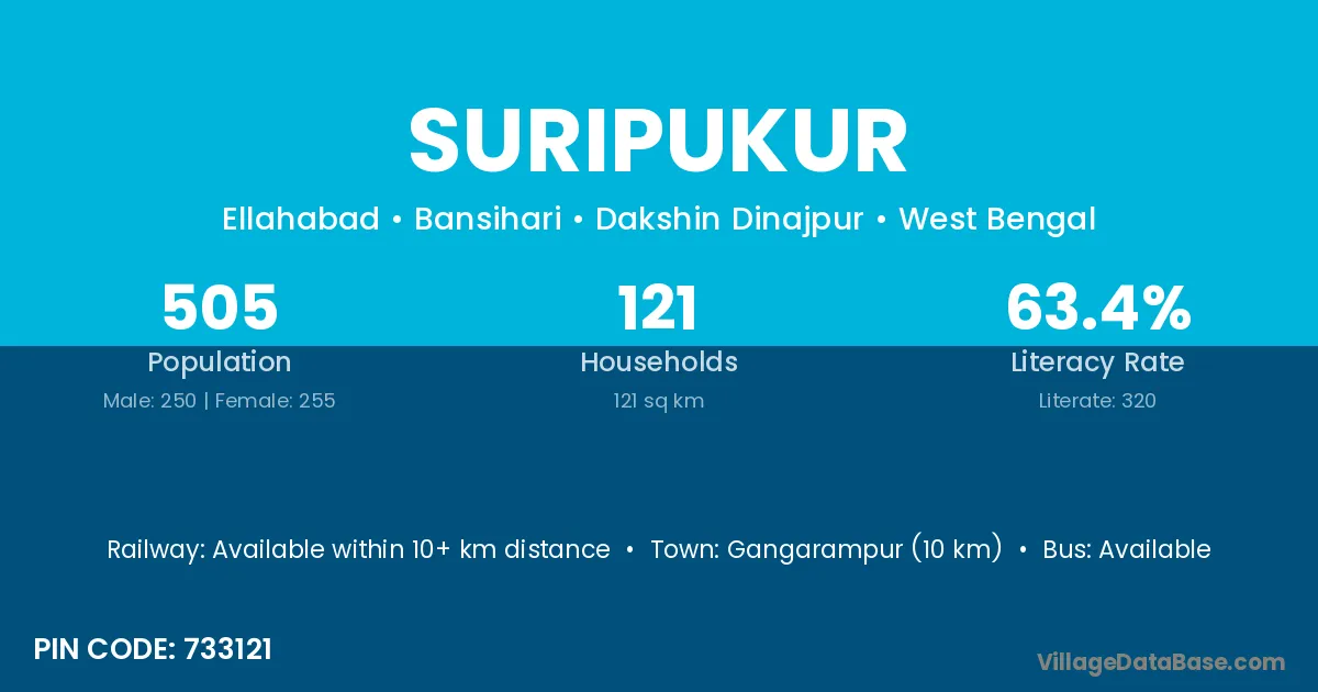 Suripukur village has a total population of 505 people, of which 250 are males and 255 are females.