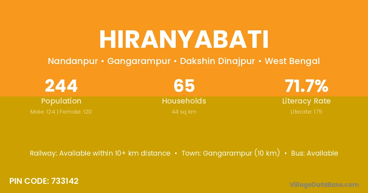 Gangarampur (10 km) is the nearest town to Hiranyabati village for major economic activities and is located approximately 10 km away.