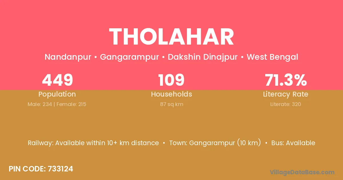 Gangarampur (10 km) is the nearest town to Tholahar village for major economic activities and is located approximately 10 km away.