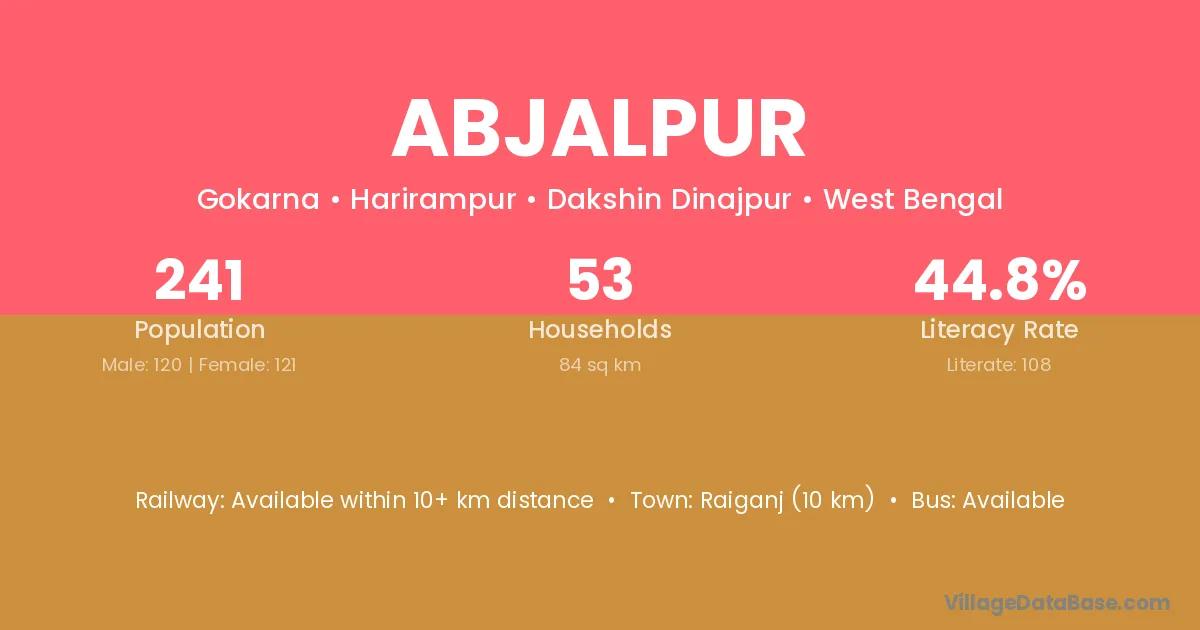 Raiganj (10 km) is the nearest town to Abjalpur village for major economic activities and is located approximately 10 km away.