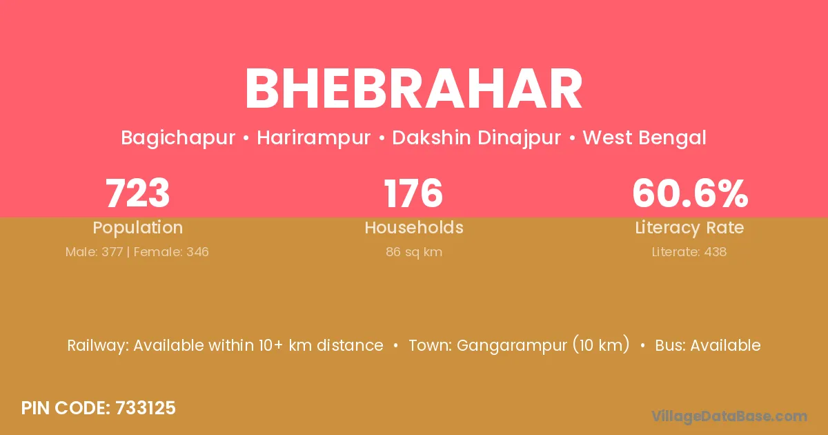 Gangarampur (10 km) is the nearest town to Bhebrahar village for major economic activities and is located approximately 10 km away.