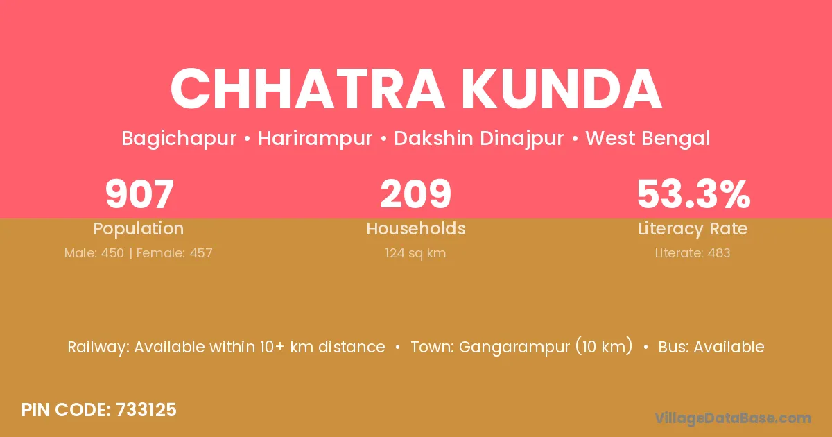 Gangarampur (10 km) is the nearest town to Chhatra Kunda village for major economic activities and is located approximately 10 km away.